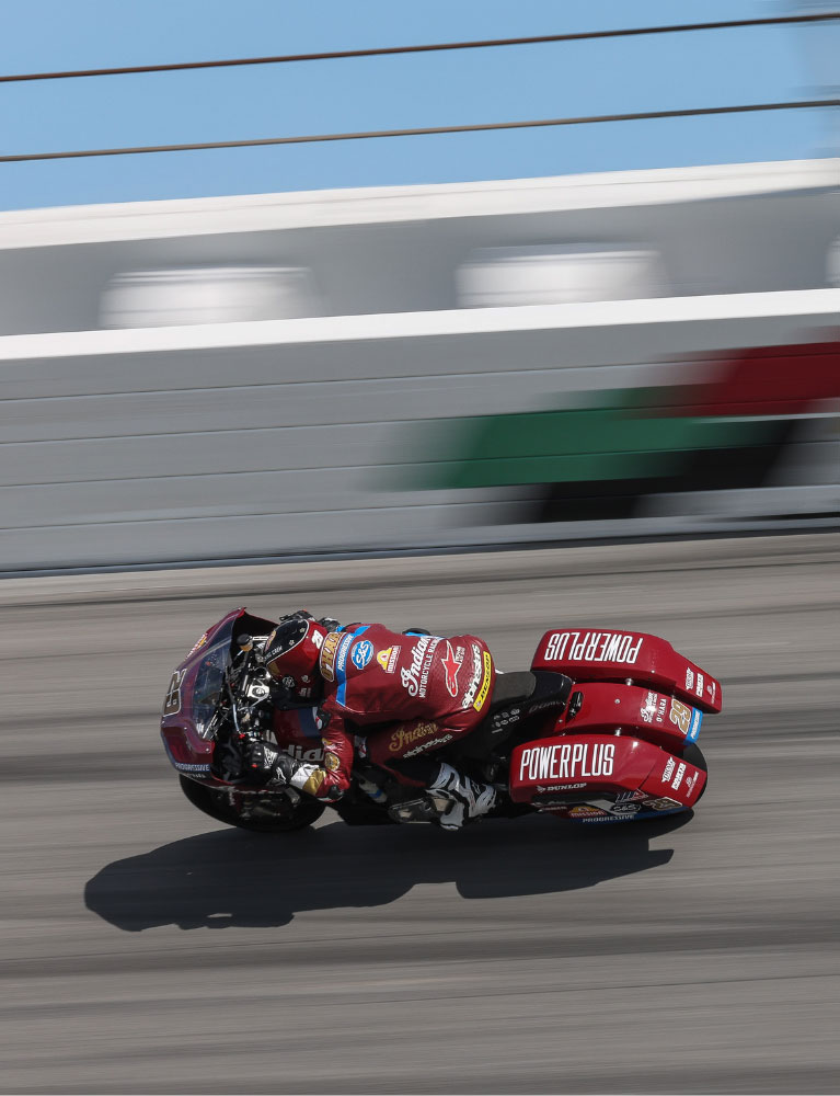 In 1909, we won the first motorcycle race ever held at Indianapolis Motor Speedway. In 1937, Ed Kretz took the first Daytona 200 on an Indian Sport Scout. The original Wrecking Crew owned the post-war racing scene. We continued that tradition with Flat Tracking Racing in the 2010s. Today's riders are doing the same at the Bagger Racing League Europe and the MotoAmerica King of The Baggers series. Different eras. Same result.